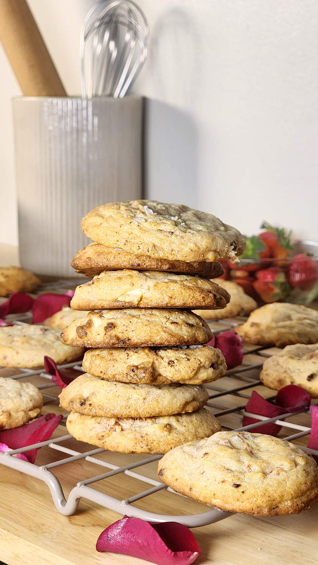 Sag in die middel met kraakvars rande en sakke romerige wit sjokolade, balanseer hierdie koekies soetheid met helder stukke aarbei. Gevriesdroogde bessies bring ‘n gekonsentreerde vrugtegeur wat elke hap spesiaal laat voel sonder om swaar te wees.