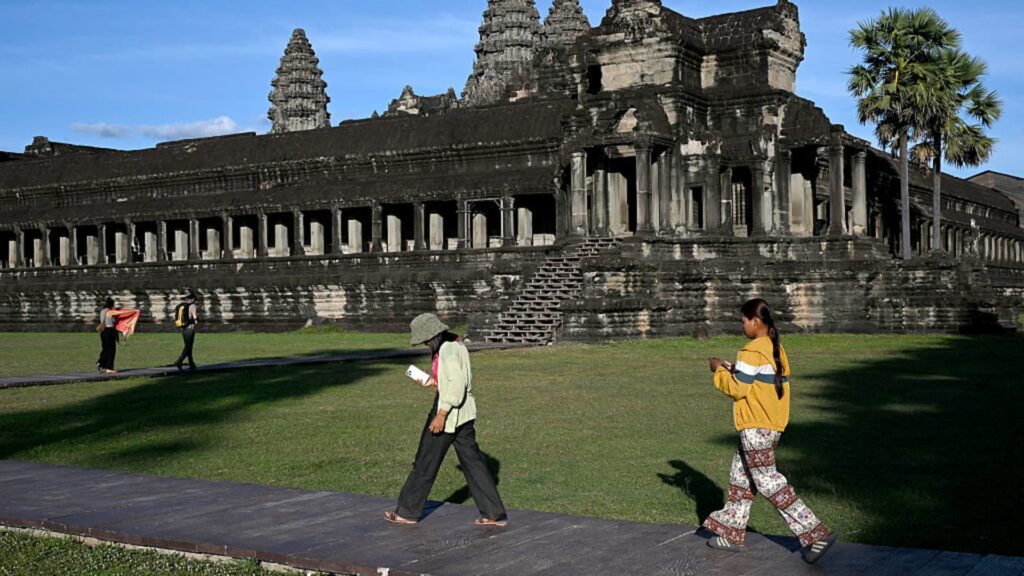 Hierdie foto wat op 18 Desember 2025 geneem is, wys toeriste wat die Angkor Wat-tempel in die Siem Reap-provinsie besoek. Reiskansellasies weens die Thai-Kambodjaanse grenskonflik het die eeue-oue klipstrukture – Kambodja se voorste toeristeaantreklikheid – ongewoon stil gelaat en besighede desperaat gelaat. (Foto deur TANG CHHIN Sothy / AFP via Getty Images) / Om te gaan met ‘CAMBODIA-THAILAND-CONFLICT-TOURISM,FOCUS’ deur Suy SE