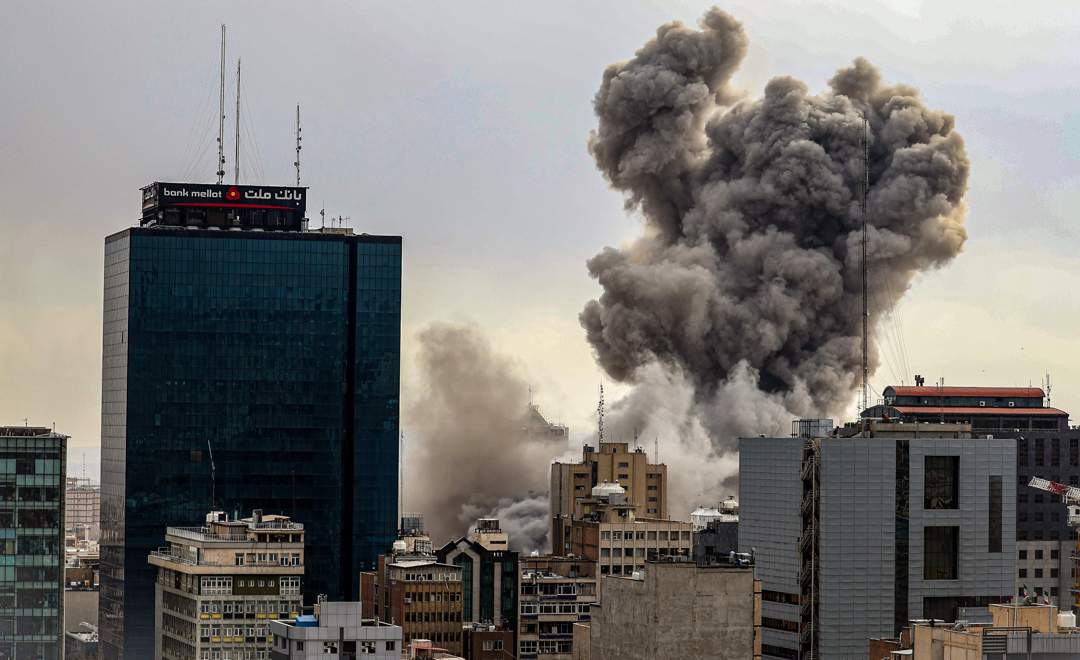 ’n Uitsig oor Teheran met rook sigbaar in die verte nadat ontploffings in die Iranse stad aangemeld is.