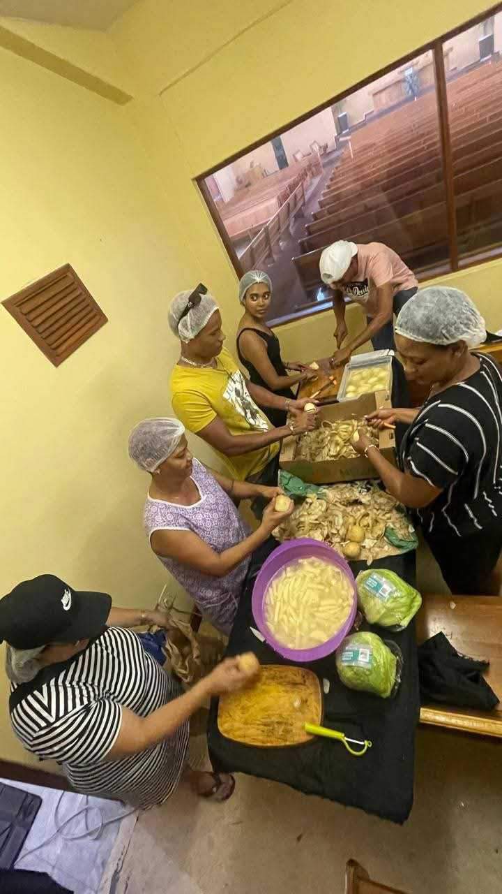 Verlede naweek se inisiatief, gelei deur meer as 30 jongmense, saam met predikante en ouers, het die kerkgebou in ‘n miernes van vreugdevolle energie omskep terwyl aartappels in skyfies gesny is, skyfies gebraai, rolletjies voorberei en toppe met sorg gelaag is. Daar is oorvloedig gesing terwyl die kos met vreugde voorberei is.