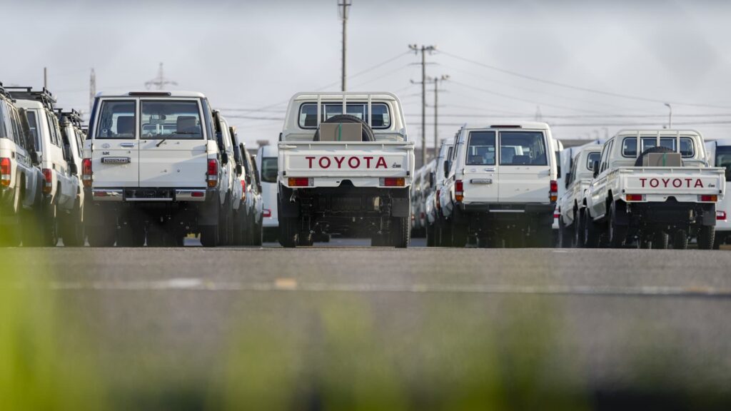 Toyota Motorkorporasie-voertuie word op Dinsdag, 29 April 2025, in die hawe van Nagoya in Tokai, Aichi Prefektuur, Japan, vervoer.