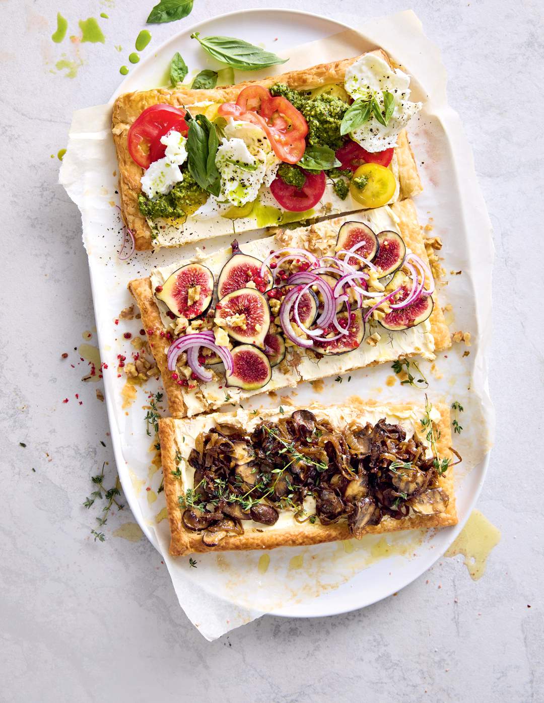 Een eenvoudige basis, drie heerlike uitkomste. Bros skilferkorsdeeg en romerige kaas vorm die fondament, dan kies jy jou vegter: ’n Mediterreense met tamatie en basiliekruid, soet-smaak met behoue vye en roket, of diep troos met gekaramelliseerde uie en sampioene.
