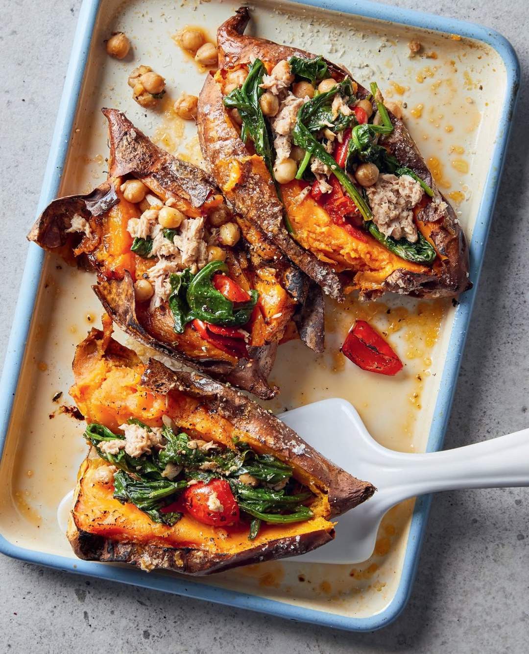 Hierdie gevulde patats tref die soet plek tussen hartlik en heilsaam. Donserige geroosterde patats word gevul met ‘n proteïenverpakte mengsel van pittige kekerertjies en tuna vir ‘n vinnige, geur-voorwaartse maaltyd wat die besigste smaakknoppies bevredig.