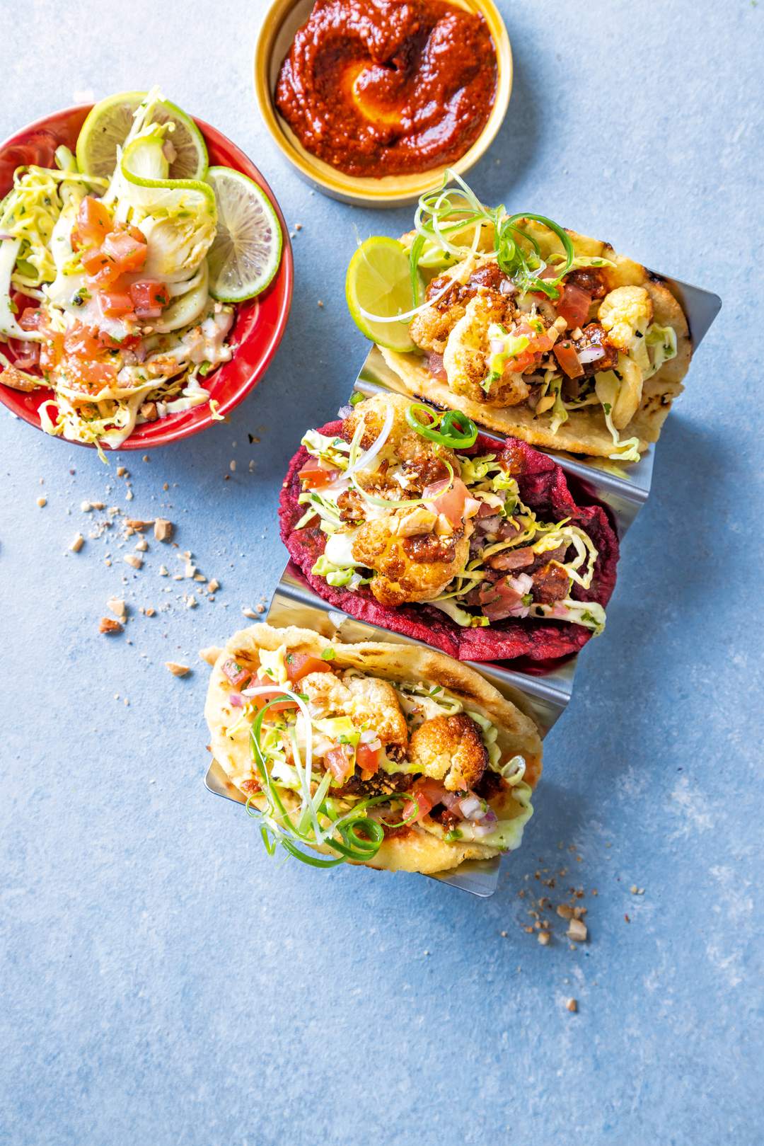 Geroosterde blomkool ontmoet vet, rokerige romesco-styl geure geïnspireer deur die klassieke Spaanse sous. Versteek in warm tortillas met jou gunsteling-toertjies, is hierdie taco’s pittig en bevredigend.