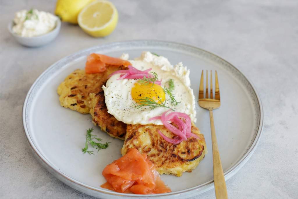 Bros aartappelkoekies met syagtige gerookte salm en ‘n helder, geklopte suurlemoenfetakaas. Die smeer verdubbel ook as ‘n dip of, wanneer dit met jogurt losgemaak word, verander dit in ‘n lekker slaaisous wat jou nuwe yskasstapelvoedsel kan word.